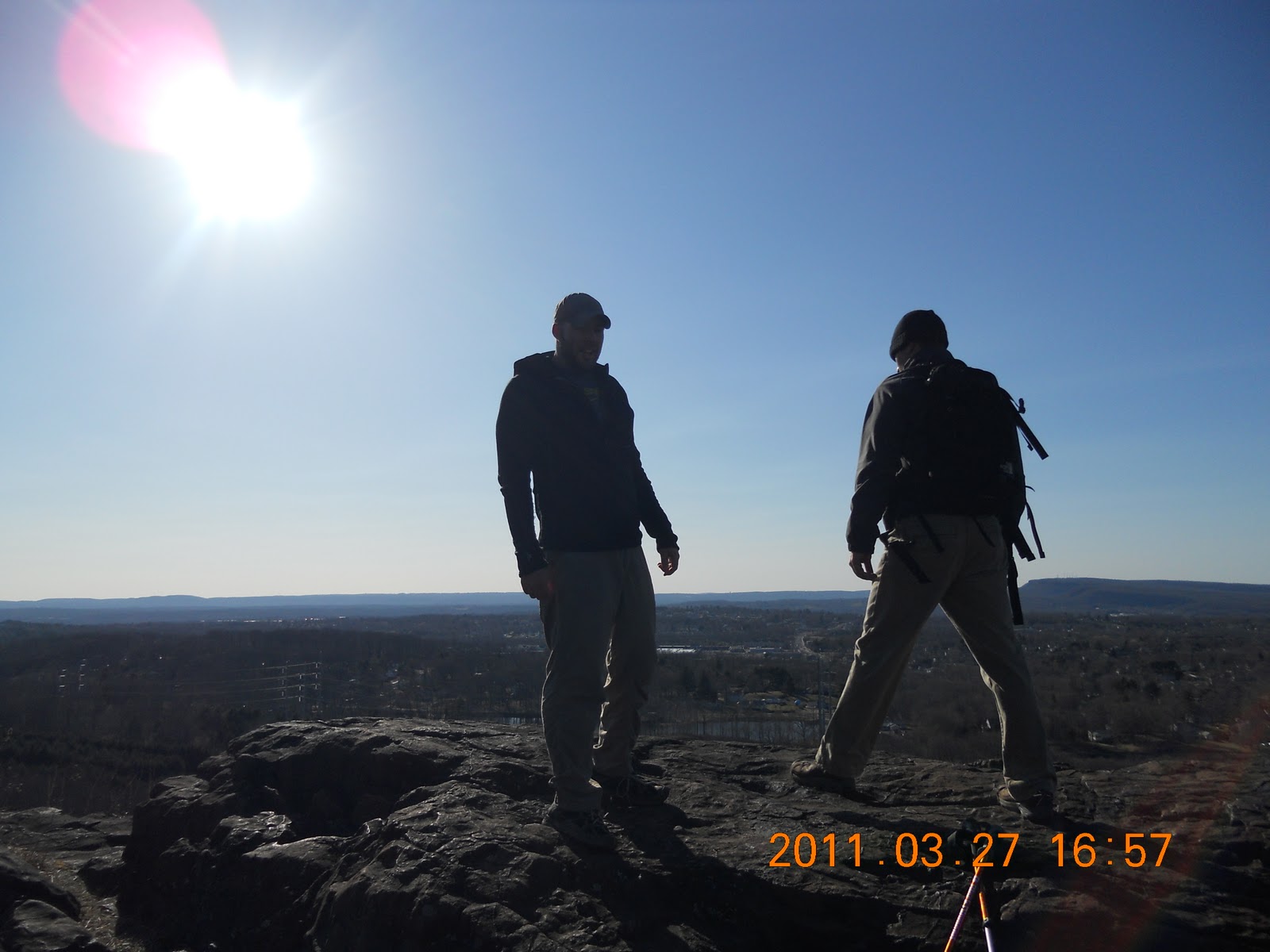 So today Mr. D and my buddy Mr. N and his finance took a hike on the other side of a highway from where myself and several other friends hiked Mt. Higby. I have done Mt. Higby a bunch of times but could never figure out where the trail continued over the highway. So after some reasearch we discovered that both sides of the Mt. where just parts of the 63 or 63 mile Metacoment Trail, so we where like neat we should just be able to find the trail head on the other side of the highway, find some place to park and go from there. That's exactly what we did. It was a good day out, nice and cool but extremely windy once on top of the mountain. The hiking was good, the trail was clearly beaten in to the forest floor, but there were also many different dirt bike and atv trails breaking off so we had to keep checking for the blue blaze of the Metacomet so we wouldn't end hiking head long into an atver, which we heard in the distance. Once up on top of the mountain the view was amazing. We could see all the way to New Haven which is approximately 20 miles to the south.